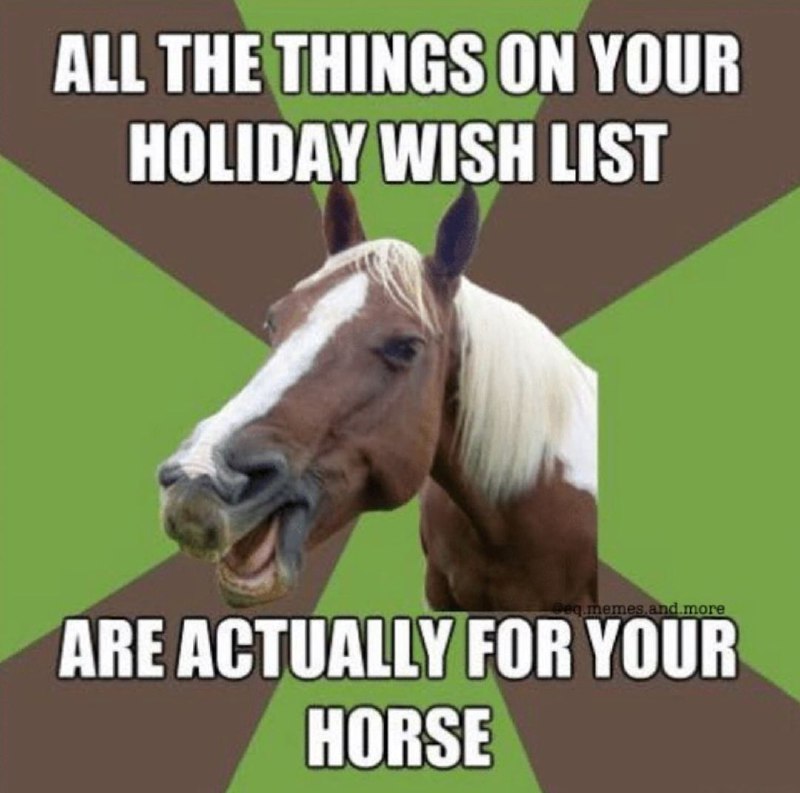 Share Share on Facebook Share on Twitter Pinterest Email Spread the love All the things on your holiday wish list… There are two types of horses at a show… Me: 1 2 3 4 5 Horsememes 0 Dylan Harper Website Related Posts What Horse Race Is Today? October 4, 2022 Is it Too Hot to Ride Your Horse? October 4, 2022 Can Horses Eat Pumpkin? October 4, 2022 Write A Comment Cancel Reply Save my name, email, and website in this browser for the next time I comment. Δ