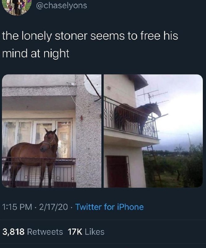 Share Share on Facebook Share on Twitter Pinterest Email Spread the love Look at him living life like he’s paying his own Vet bills… The lonely stoner seems to free his mind at night. 1 2 3 4 5 Horsememes 0 Dylan Harper Website Related Posts What Horse Race Is Today? October 4, 2022 Is it Too Hot to Ride Your Horse? October 4, 2022 Can Horses Eat Pumpkin? October 4, 2022 Write A Comment Cancel Reply Save my name, email, and website in this browser for the next time I comment. Δ