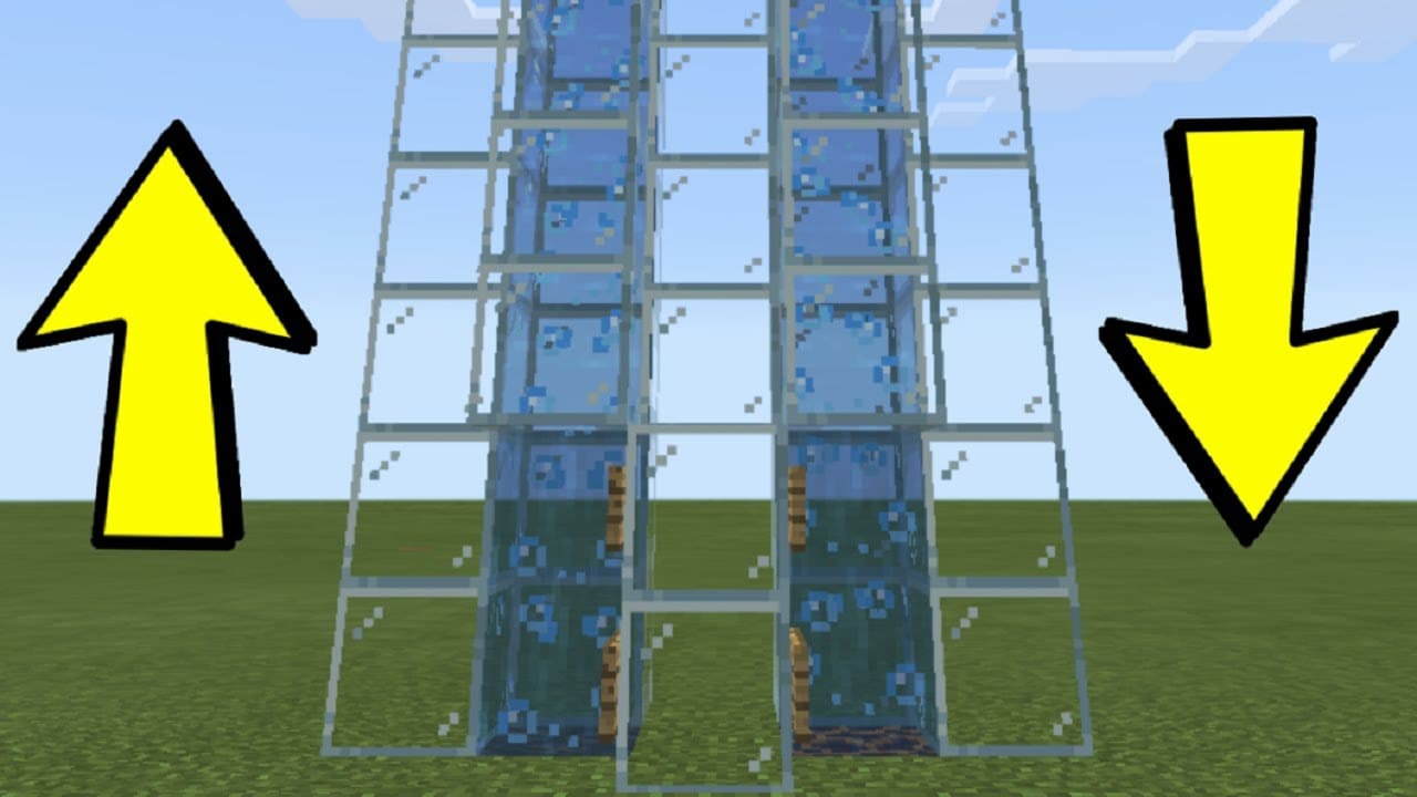 Now players have a very tall contained 1×1 of water. Next, they will need to put either a Magma Block or a Soul Sand at the bottom of the elevator. Magma Blocks will pull players down from the top through the water, and the Soul Sand will push the players up through the water when placed at the bottom.