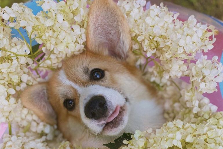 Unusual dog Beautiful dog in flowers