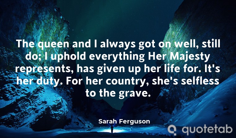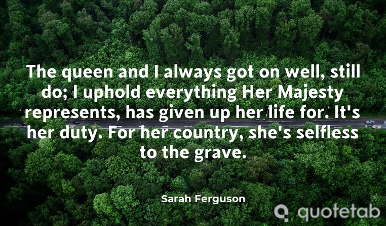 The queen and I always got on well, still do; I uphold everything Her Majesty represents, has given up her life for. It's her duty. For her country, she's selfless to the grave.
