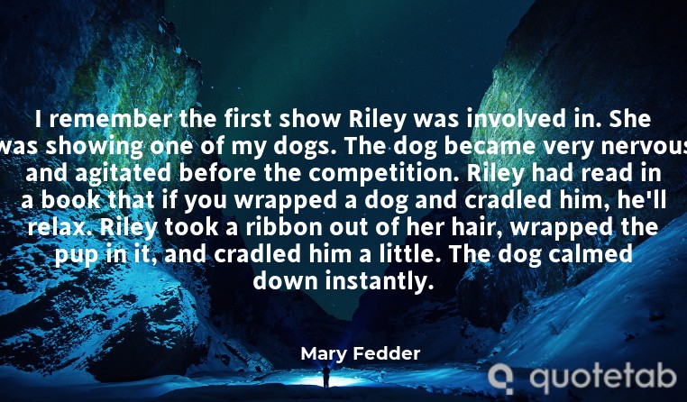 I remember the first show Riley was involved in. She was showing one of my dogs. The dog became very nervous and agitated before the competition. Riley had read in a book that if you wrapped a dog and cradled him, he'll relax. Riley took a ribbon out of her hair, wrapped the pup in it, and cradled him a little. The dog calmed down instantly.