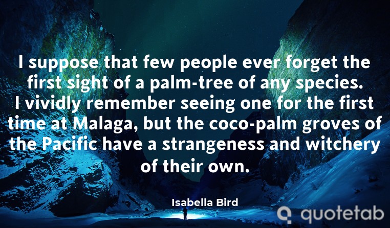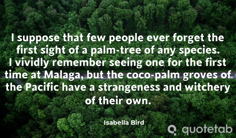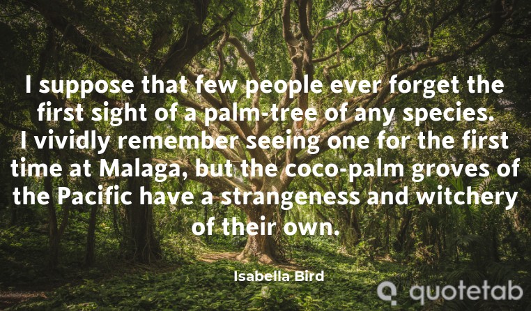 I suppose that few people ever forget the first sight of a palm-tree of any species. I vividly remember seeing one for the first time at Malaga, but the coco-palm groves of the Pacific have a strangeness and witchery of their own.