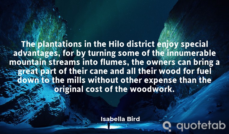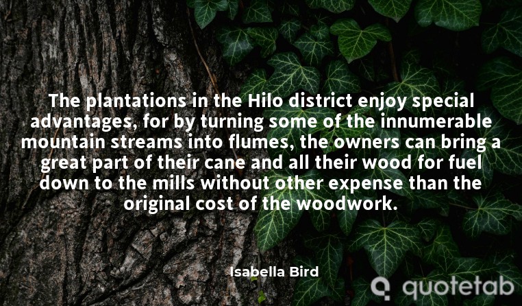 The plantations in the Hilo district enjoy special advantages, for by turning some of the innumerable mountain streams into flumes, the owners can bring a great part of their cane and all their wood for fuel down to the mills without other expense than the original cost of the woodwork.
