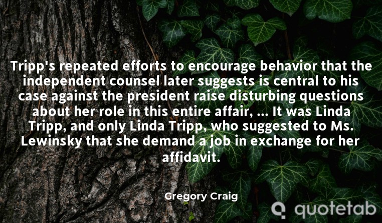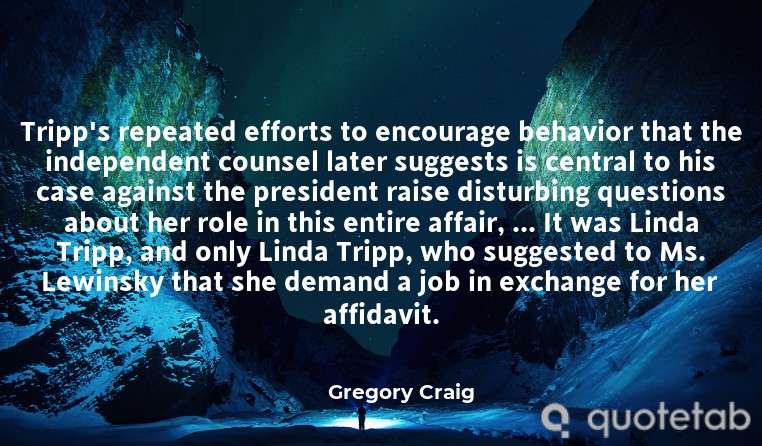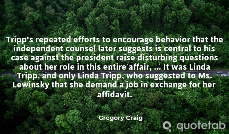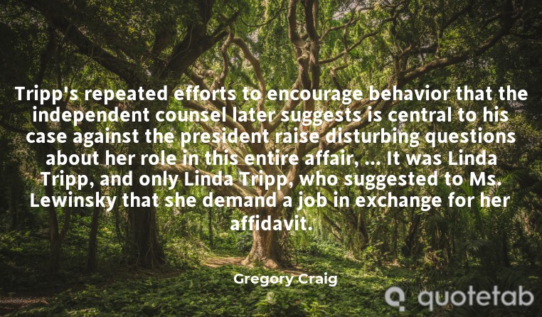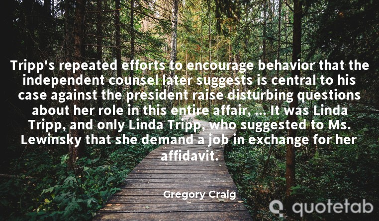 Tripp's repeated efforts to encourage behavior that the independent counsel later suggests is central to his case against the president raise disturbing questions about her role in this entire affair, ... It was Linda Tripp, and only Linda Tripp, who suggested to Ms. Lewinsky that she demand a job in exchange for her affidavit.